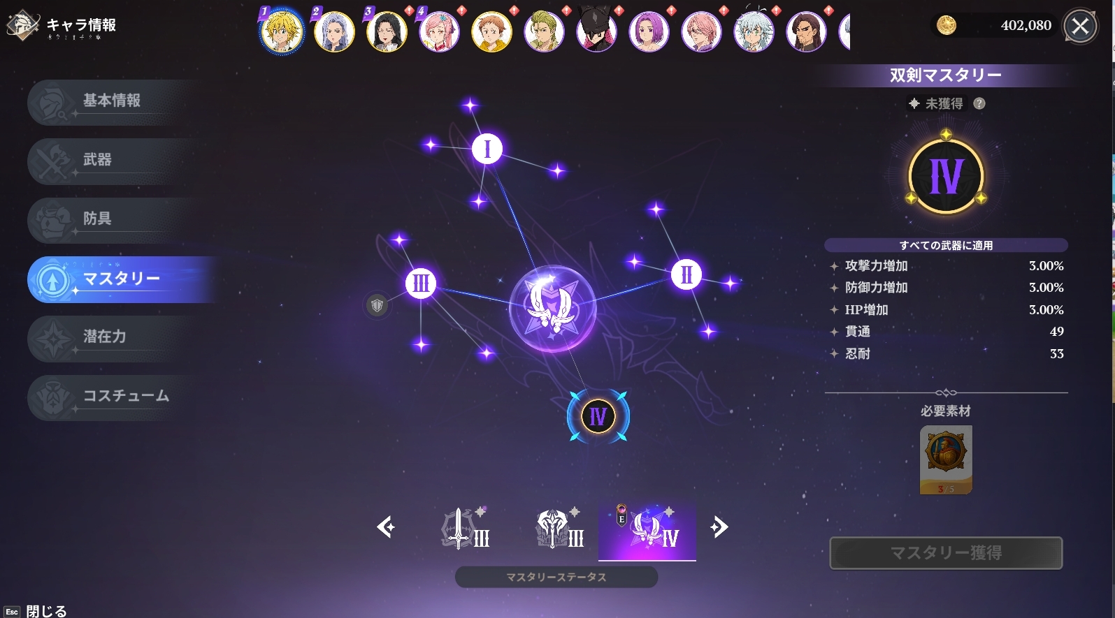 リソースはほぼメリオダス、次点で出場時間が長めのジェリコも多少は育成。ギーラはHPだけ上げれば良いレベルで、ティオレーはそれに加え回復力を上げるために攻撃力を少々盛っています。