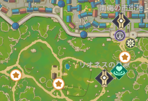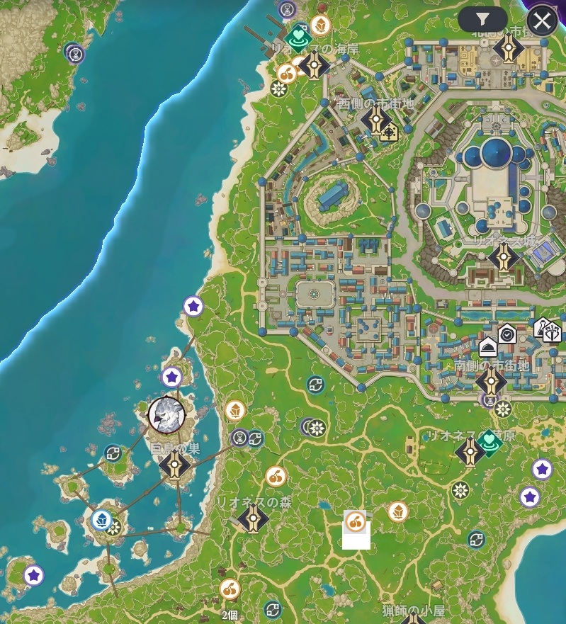 ▲リオネス。黄色の星印。月見の丘ワープのものはワープポイントのすぐ近くの小屋ですが、マーカーおけないのでズレてます。