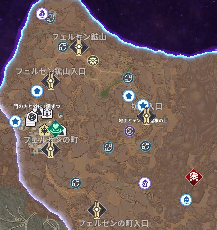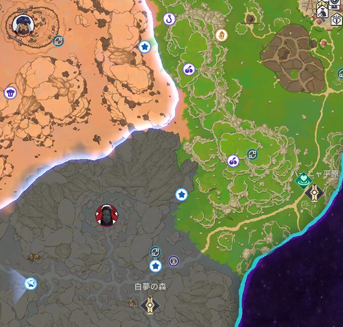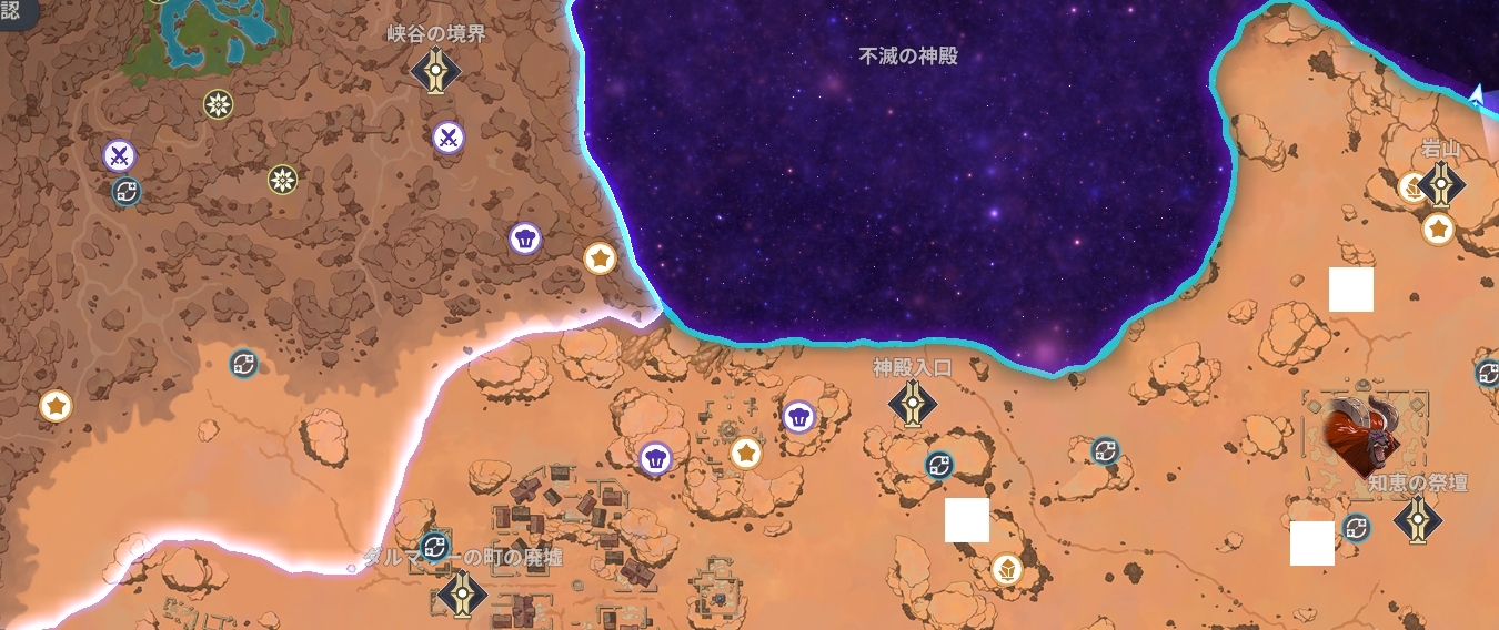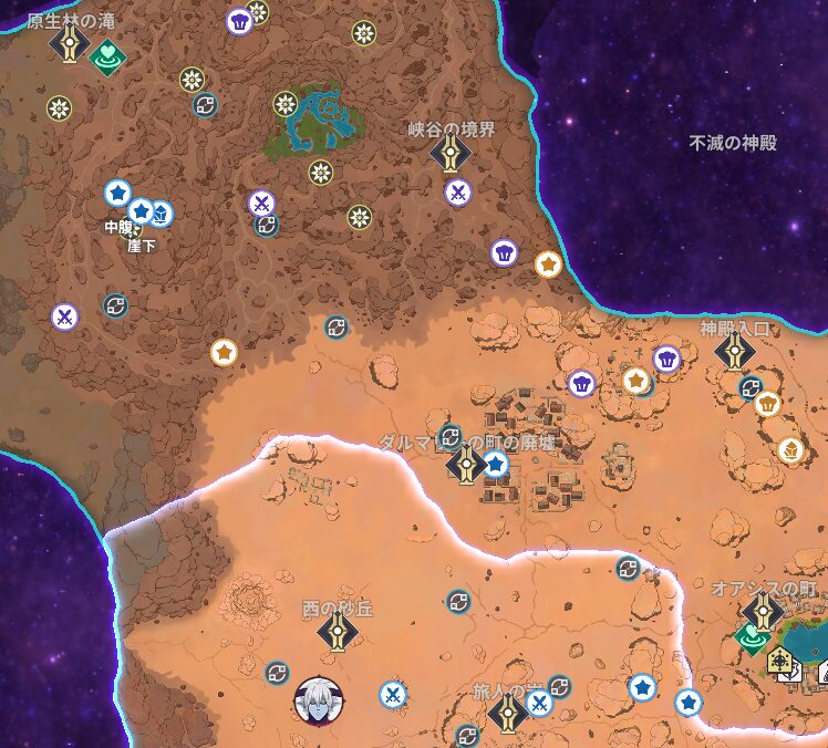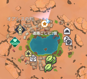 ▲オアシスの町。仕様上、葉っぱと黄色い星のどちらもという形で示しています(重ねておけないし葉っぱ全表示もできない)。あとワープポイントのすぐ東にも1つ。