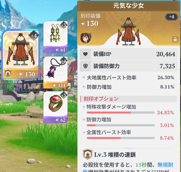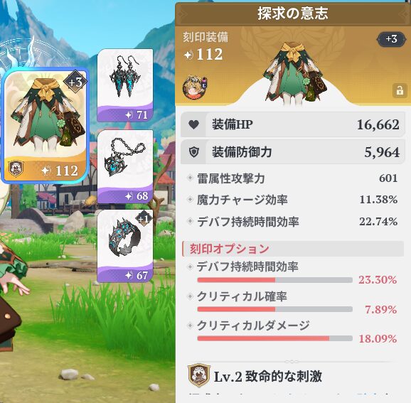 ▲刻印装備は「元気な少女」。必殺技使用後15秒間の耐久バフがとても強い。無視耐性増加付与のたびにHP回復。