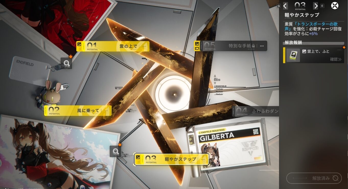 当初はギルベルタ2凸を意識したクラッシュ専用枠が1人必須かと思われたのですが、ギルベルタ個人の分だけでよさそうです。でも今後クラッシュを持つアーツアタッカーが増えれば迅速に重複させられて面白いかも。
