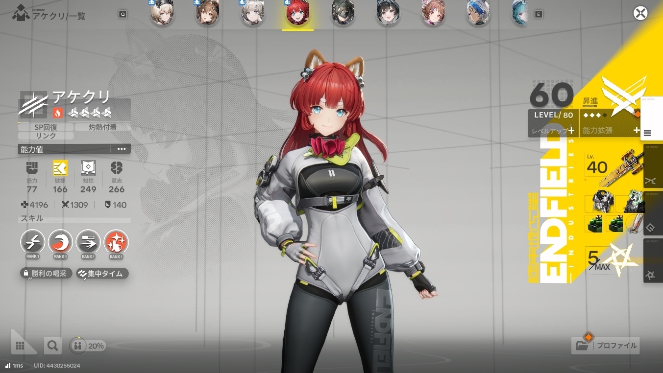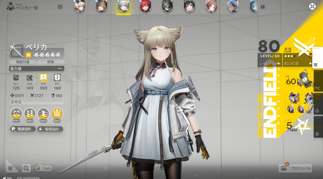 育成PTは「つなぎ」と割り切って、管理人、チェン、アルデリア、そして序盤の惰性でレベルを上げたペリカの4人。管理人のみレベル80で他は60で、管理人以外への投資は最小限という構成です(管理人への投資すら結構渋ってる)。正直この編成でも既存のダンジョンクリア自体は問題ないレベル。