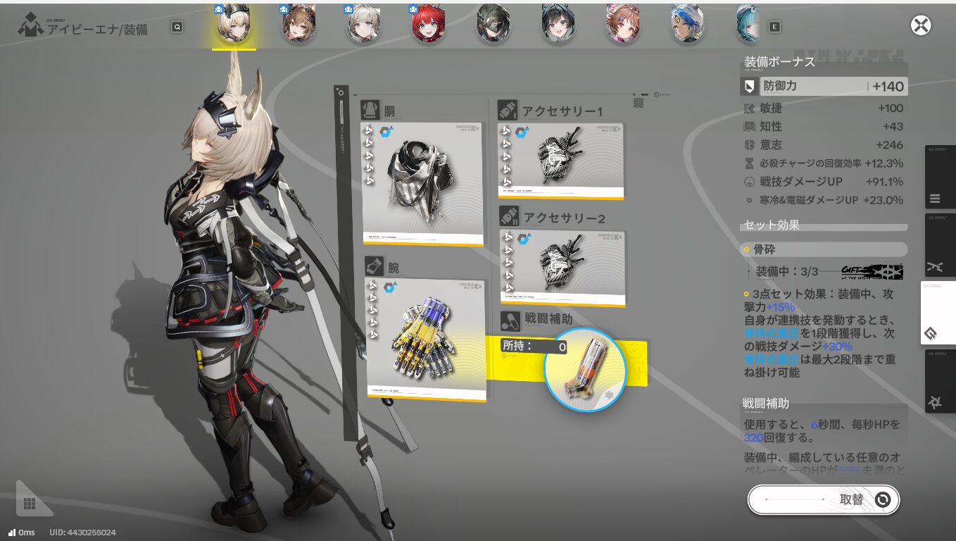 ▲装備は他の全てを度外視で必殺チャージの回復効率優先。アクセは単品の救国印章。多少は精密加工していますがリソースが尽きたので中途半端。ローテ短縮しやすくするために、もうちょっと上げたいかなというのが個人的な感想。
