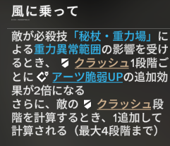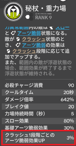 | 必殺技 | 自然付着、スロー、アーツ脆弱 アーツ脆弱はクラッシュ段階数で追加上昇 |