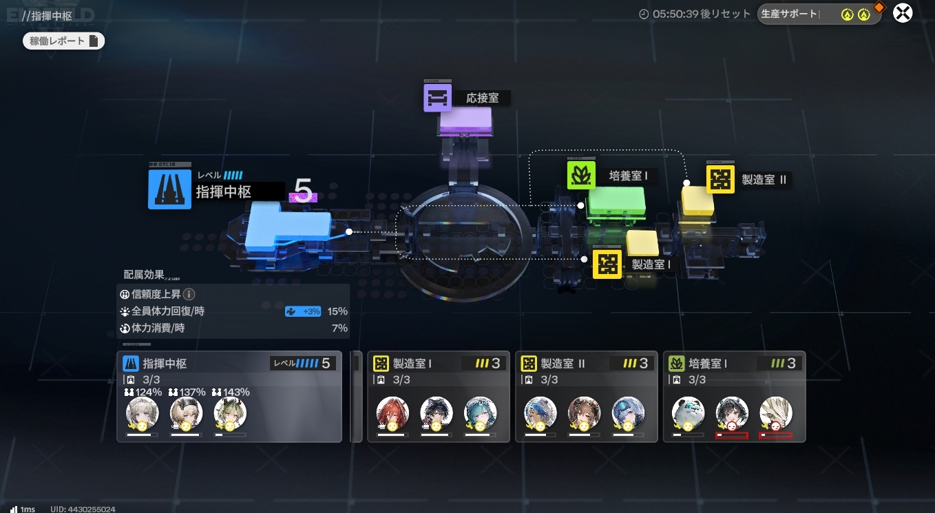 製造室や培養室からのアイテム回収と再生産。そして応接室の手がかり受け取り。サポートの受け取りも忘れずに。