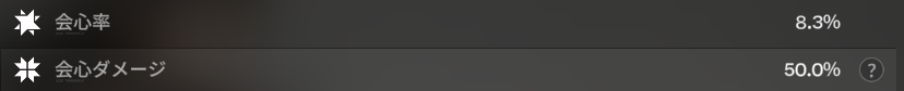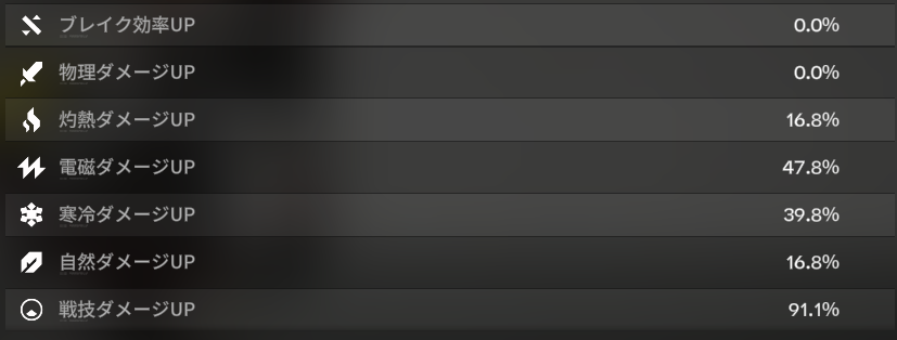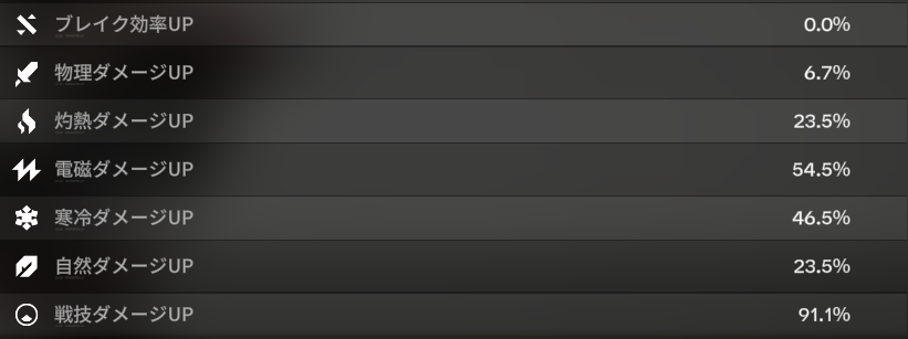 会心率の伸びは3.3%。表記上は3%のはず。妙だな…? 一方、物理ダメージは0%から6.7%に。じゃあ電磁ダメージはというと54.5 – 47.8 =6.7(%)。妙だな…????
