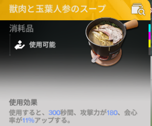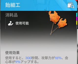 攻撃力に加え会心率も上がることから、総合的に強くなる消耗品として効果的であるといえるでしょう。