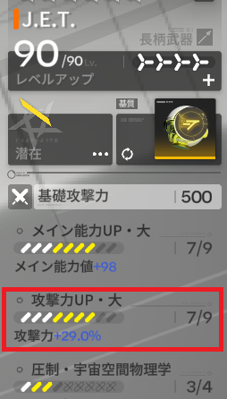 画像の赤枠部分ですね。このステータスは%表記ではありますが、伸びた値は基礎攻撃力に加算され、その合計が能力値付加%に乗算されるのが特徴です。