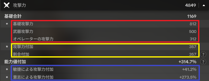 画像の黄枠は何? と思った人もいると思います。これは「固定値に直接かかる攻撃力%」という中間の概念です。