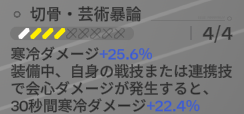 イヴォンヌはモチーフ武器で関連ダメージがさらに上昇。そしてザイヒを編成している場合は必殺技持続時間に限りさらに寒冷増幅がかかります。つまり実戦での価値はもっと落ちる。