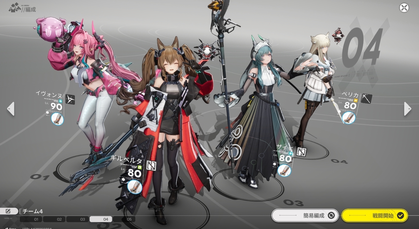 イヴォンヌ、ギルベルタ、ザイヒ、ペリカというまあありふれたテンプレPTで挑みました。ただし白亜TAにおいてこれが最適解かというと微妙なところです(ペリカより立ち回り要員かサブアタッカーのほうが良かったかも)。