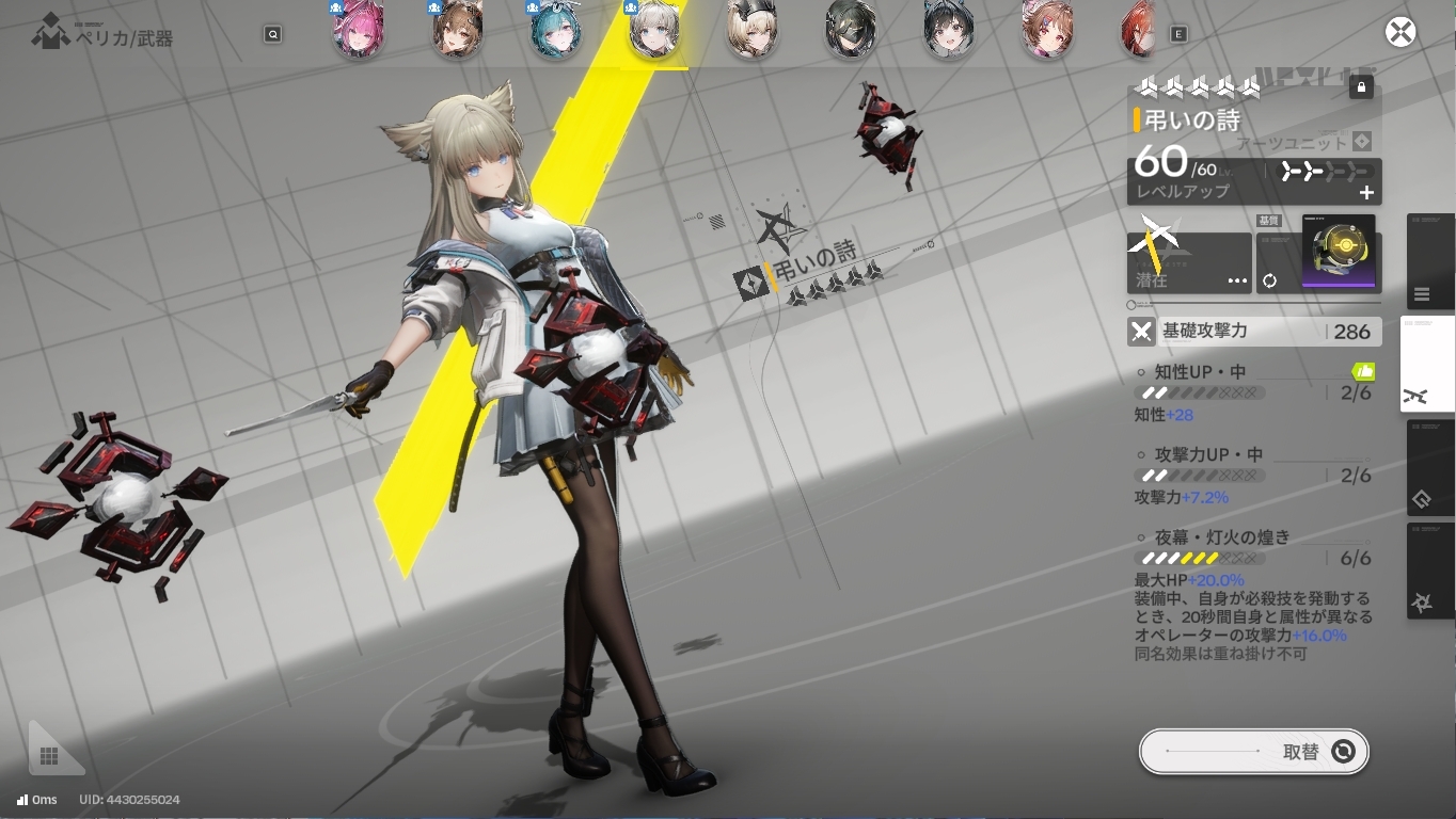 ▲ペリカも育成度合いは変わっていませんが、武器を弔いの詩に変えています。荒野が電磁or物理専用なのに対して、弔いは自属性以外のパーティならどこにでも持っていけます。
