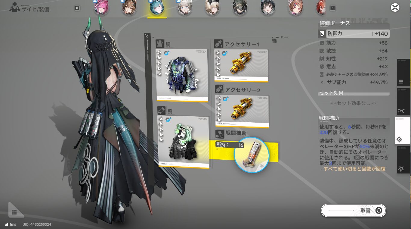 防具は電磁PTと異なりパルスのセット効果を生かすことができませんが(本人のダメージは一応上がるが)、アーツ強度を稼げる装備なのでそのままにしました。