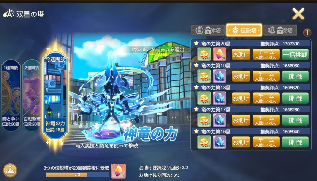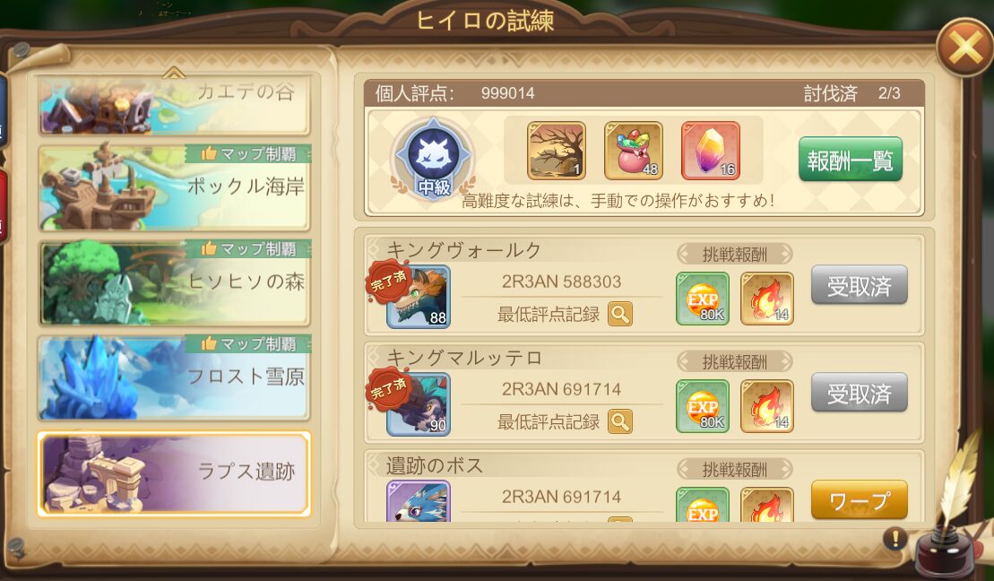 ▲今週冒険記(毎週更新)と双週冒険記(隔週更新)はミッションをクリアすることで報酬獲得可能。全部消化すると、虹ダイヤ消費でレベルアップし、報酬獲得回数をリセットすることができます。レベル3までは30ダイヤで済むのでお得。それ以上は好み。
