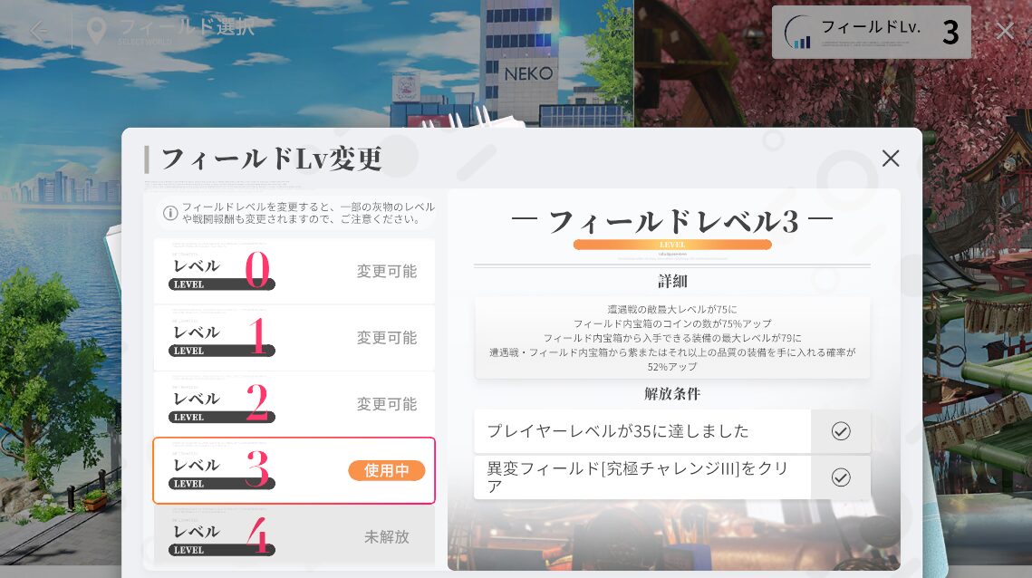 プレイヤーレベルの経験値はスタミナ消費で得られますが(生産のCPではない)、フィールド探索(オーバーフィールドと、その中の異変フィールドなど)を進めることでも上昇できるので、深淵に本格的に挑む前に探索はコンプリートしておきたい。