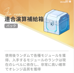 記念品のトロフィー以外で得られる報酬はコレ。セット効果付きモジュールばかり、しかもオレンジ品質が高確率で出るので、これまで滞っていた装備調達が一気に捗るのではないでしょうか。