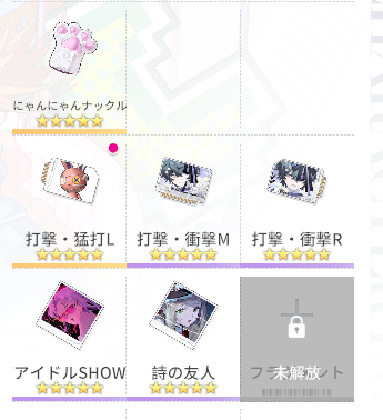 フラグメントは力場に加え打撃まで上がるアイドルSHOWの恩恵が高いです。他は力場ダメージまたは攻撃力が上がるものから選びたい。治療効果つきでアイドルSHOWの効果をアップさせる意義はありますが、治療効果以外が無意味なフラグメントをつけるのはお勧めしません。