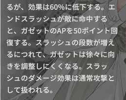 派手な斬撃攻撃の後、カッターの刃が全て砕けて近くの敵を追尾攻撃。砕けた刃による攻撃でガゼットのAPが回復します。普通に強い必殺技らしい必殺技。
