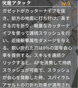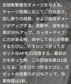 このスキルに限り固有会心率30%が付与されているのも特徴。会心が発生するたびにカッターナイフの刃を1本折ってAP25回復(最初だけ50)。