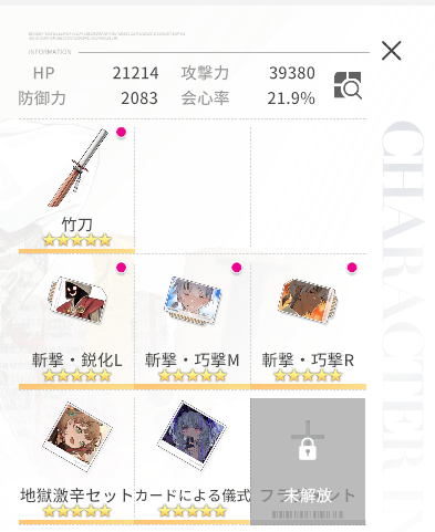 フラグメントはスキルの仕様により会心系の重要性が高めです。今回は「地獄激辛セット」と「カードによる儀式」で会心の発生とダメージを共に底上げしてみました。